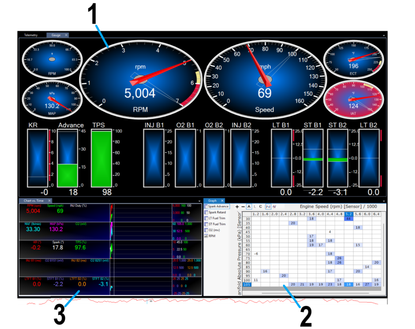 Graph panels represent sensor data and/or PIDs in a table format. This can be useful if you are gathering sample data to populate a table in VCM Editor. See Graph Panel for usage and customization instructions. |
