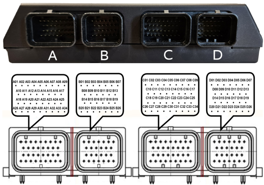 CORE has four connectors on the bottom end of the ECU (Figure 6). Each connector head has 34 or 26 contacts with four rows, combined 120 contacts total with all four connectors.