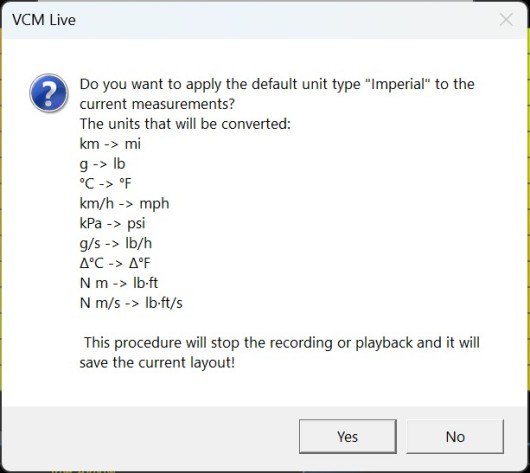 If you click No, parameters that have already been added to your layout will retain their current units, but parameters you add from now on will default to the new unit type.