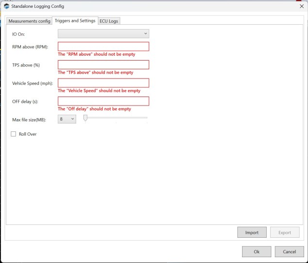 NOTE: RPM, TPS reading, and vehicle speed must all be above the thresholds specified on this page in order to begin recording. If you have an input selected for IO On, that switch must be in the ON position as well.
