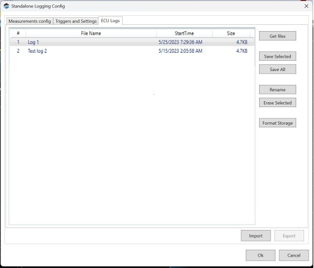 | 1. | On the ECU Logs tab of the Standalone Logging Config window, click the Get Files button. This will retrieve the list of log files currently stored on the ECU. |