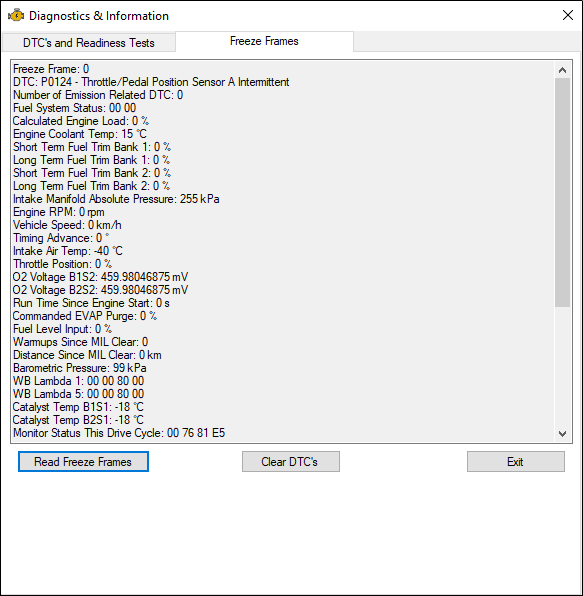 Some vehicles can report freeze frame data captured at the moment a DTC is set. This may be useful if you are trying to troubleshoot a DTC on a vehicle that supports this function.