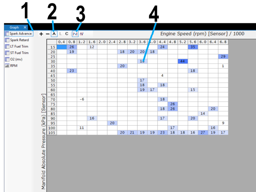 This type of graph can be particularly useful if you set up the tables to match tables you want to tune in VCM Editor. Having a matching table allows you to: