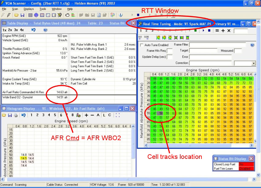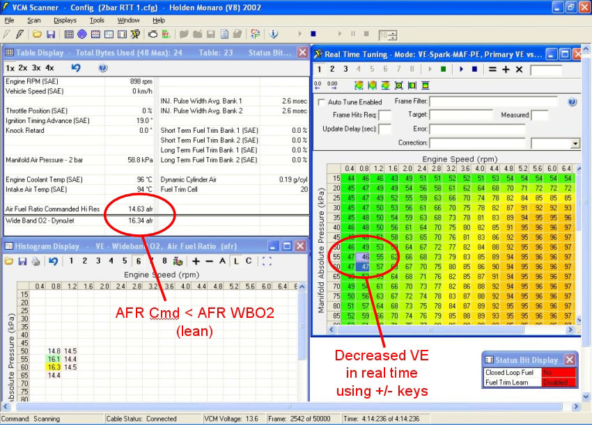 The images below show real time modification of the VE table at openloop idle and the effect on measured AFR.