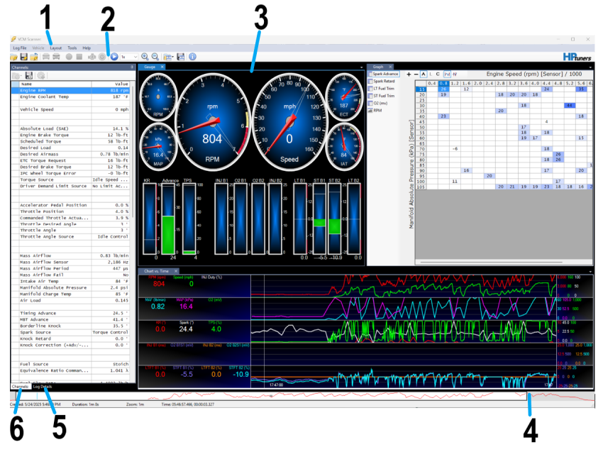 Data Display Panels. When actively scanning a connected vehicle, the panels in this area display live data gathered from the vehicle. When viewing a log file, they display the logged data. All of these displays are highly configurable. They can be set up to show the performance and troubleshooting data most appropriate for the task at hand. See Layouts for more information. |